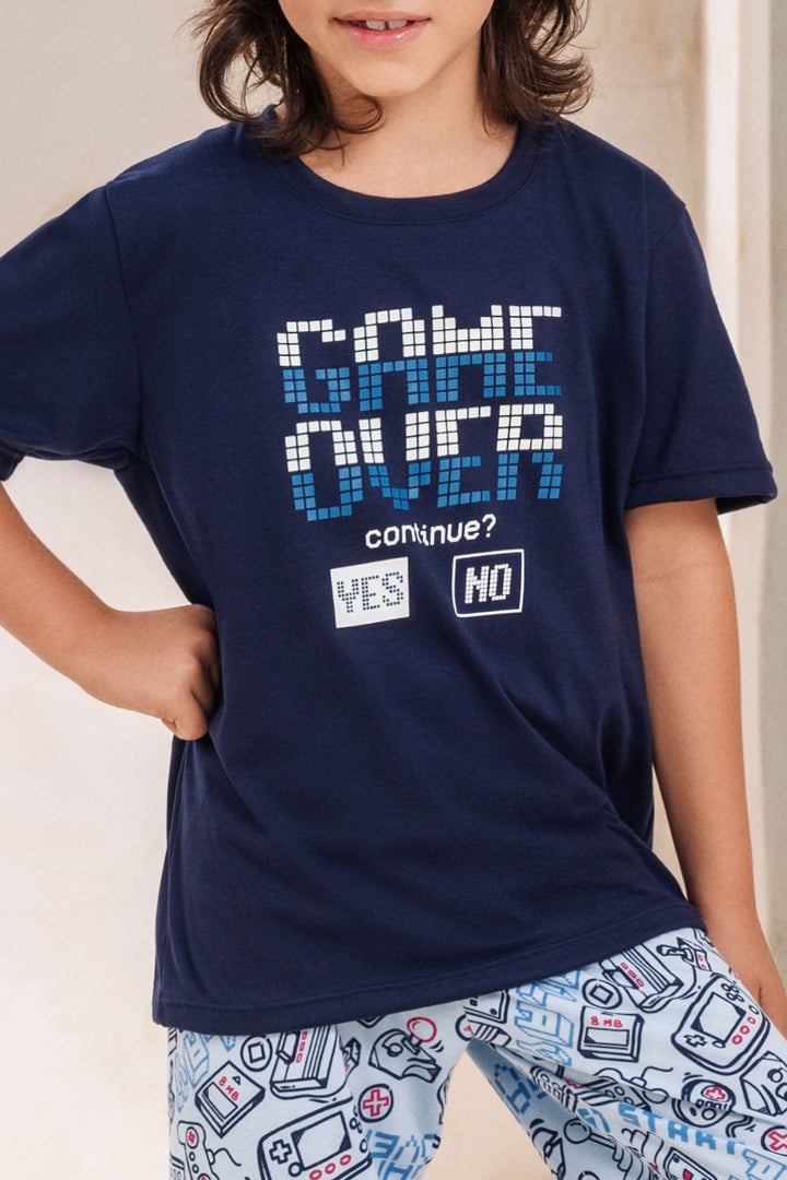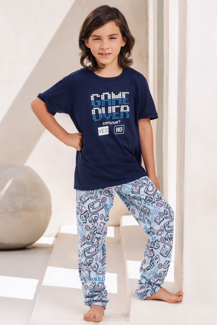 Pijama de niño suave y cómoda con Camiseta estampada manga corta, diseñada junto a un pantalón estampado con cintura elástica.