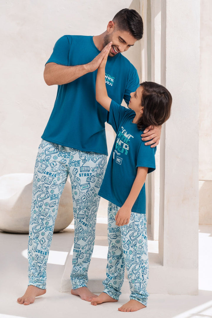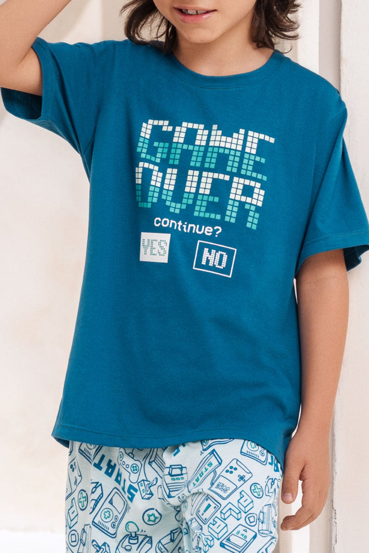 Pijama de niño suave y cómoda con Camiseta estampada manga corta, diseñada junto a un pantalón estampado con cintura elástica.