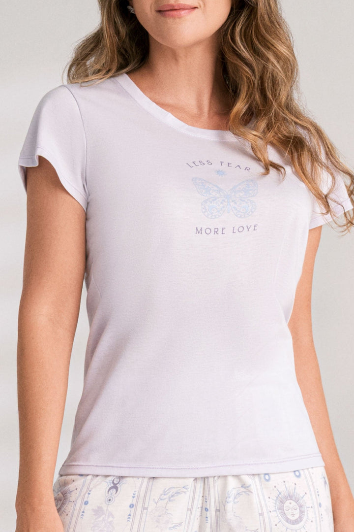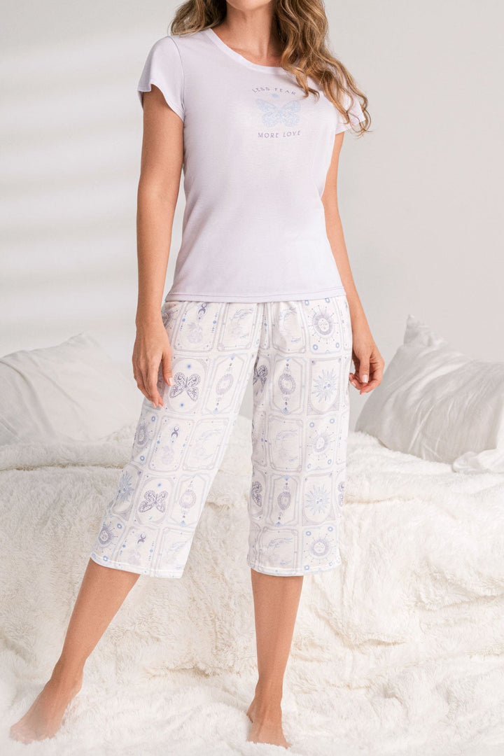 Pijama para mujer en algodón suave y cómoda, con camiseta manga corta diseñada junto a un capri estampado con cintura elástica