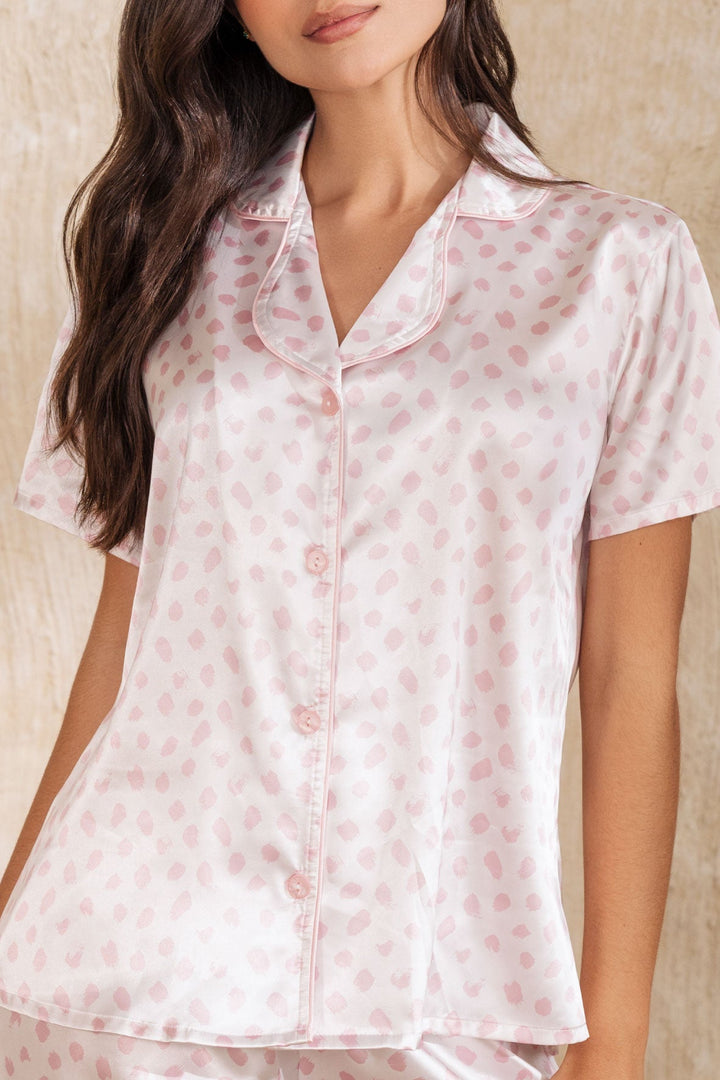 Pijama para mujer en satín estampado con camisa manga corta con botones y short de cintura elástica para un ajuste perfecto.