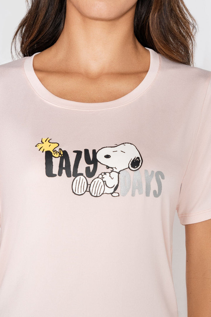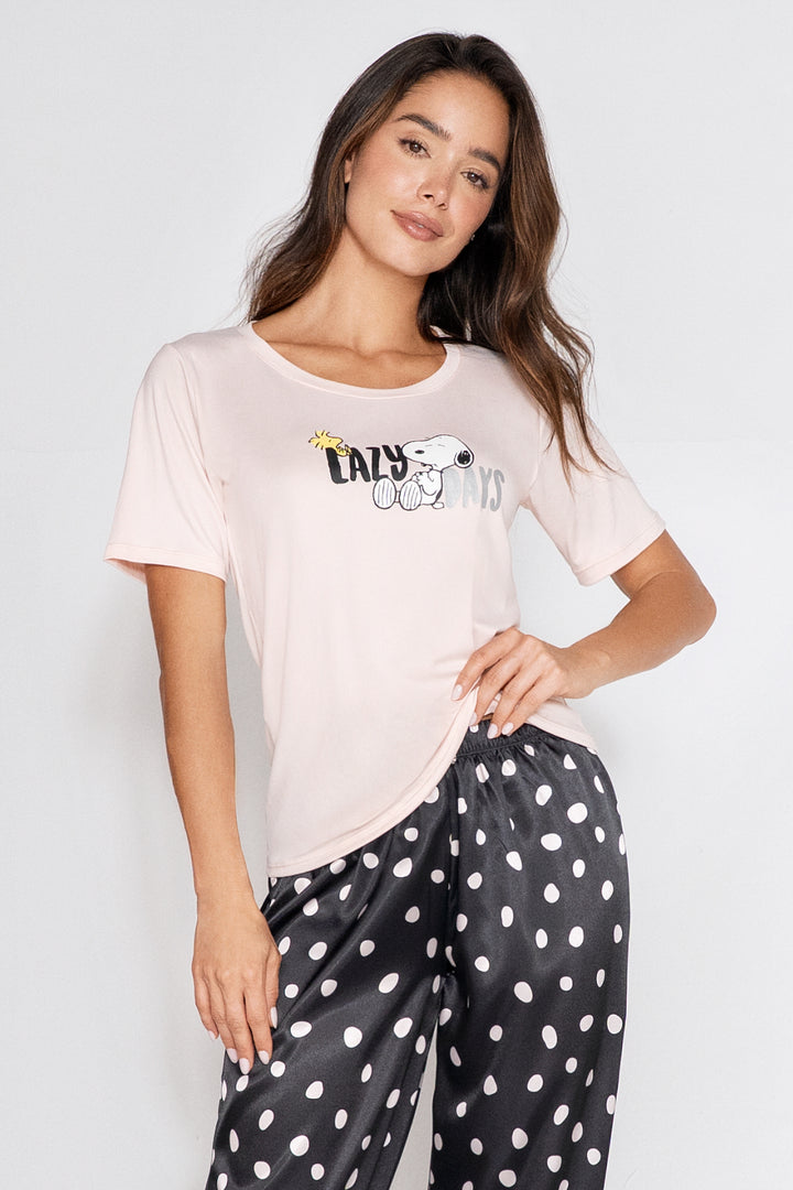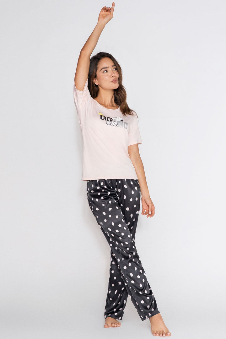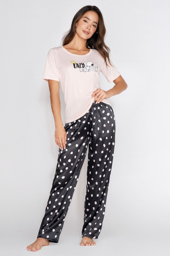 Pijama para mujer en Satín con pantalón de cintura elástica y camiseta manga corta estampada.