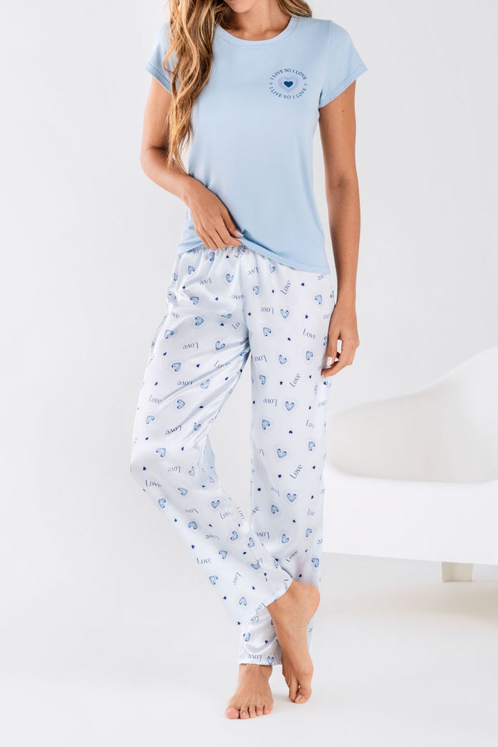 Pijama para mujer en Satín con pantalón de cintura elástica y camiseta manga corta estampada.
