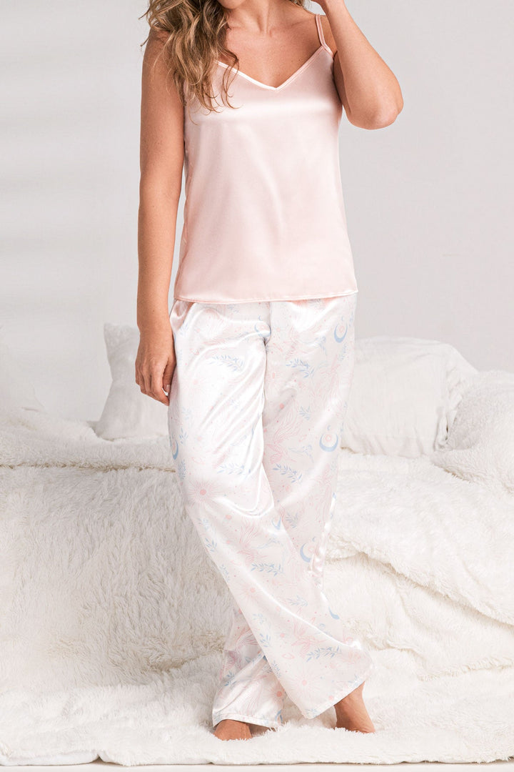 Pijama para mujer en pantalón de satín estampado con cintura elástica y blusa de tiras ajustables.
