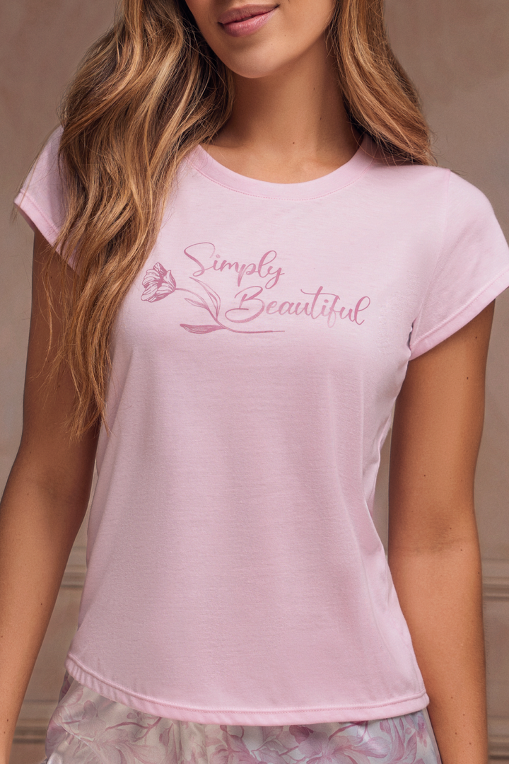 Pijama para mujer en satín con short de cintura elástica y camiseta manga corta con estampado localizado