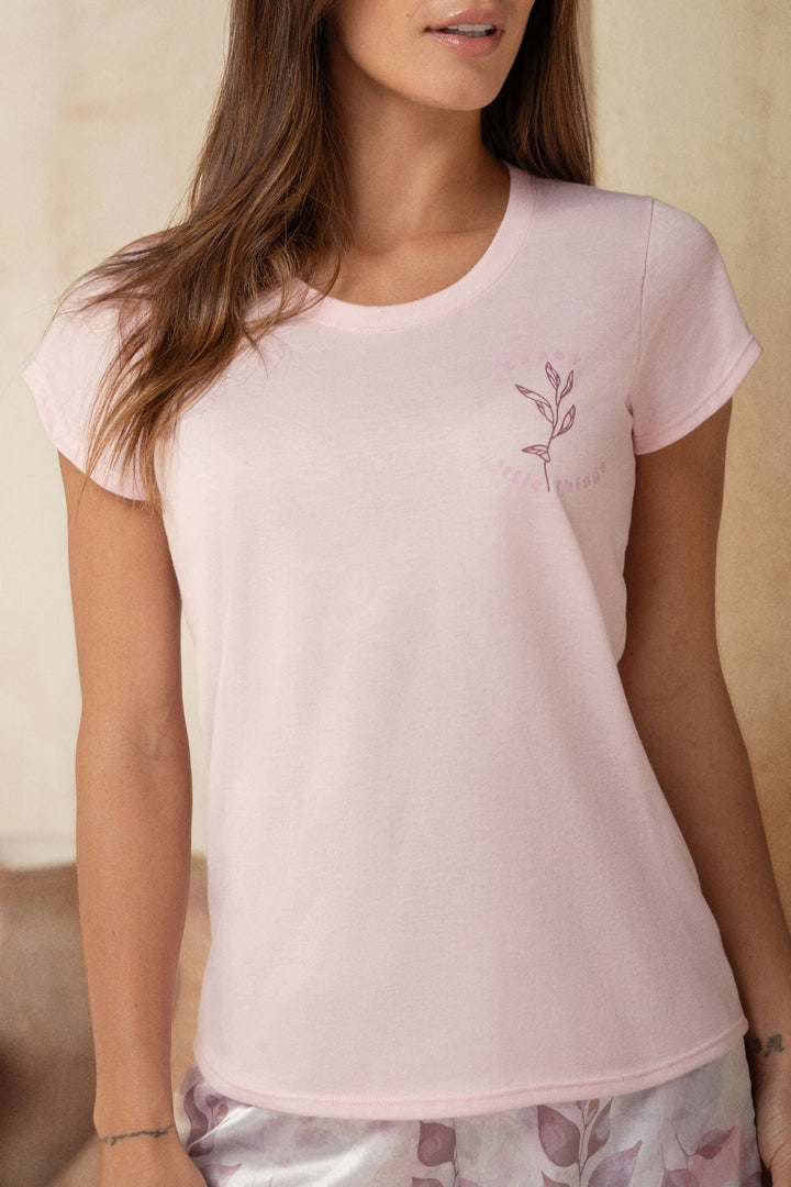Pijama para mujer en satín con short de cintura elástica y camiseta manga corta con estampado localizado