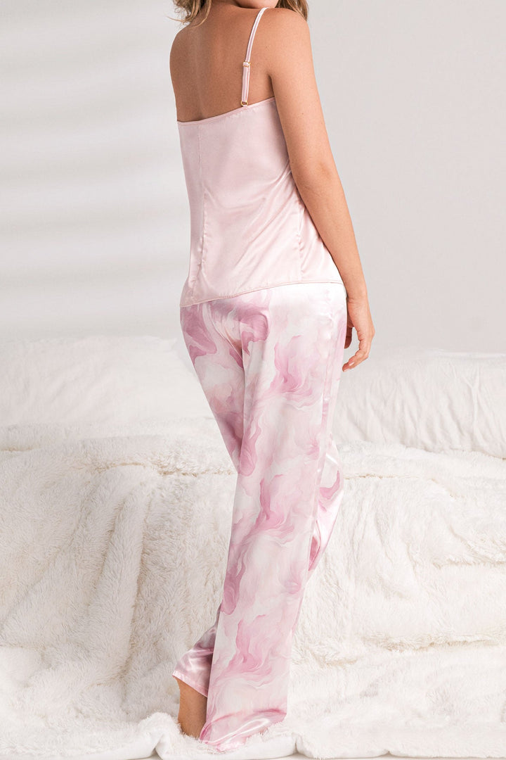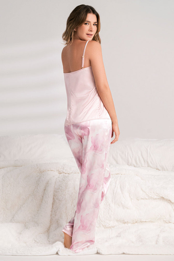 Pijama para mujer en pantalón de satín estampado con cintura elástica y blusa de tiras ajustables.