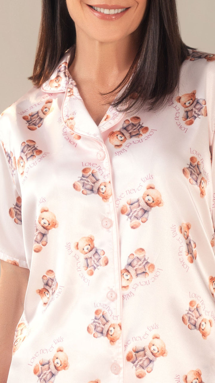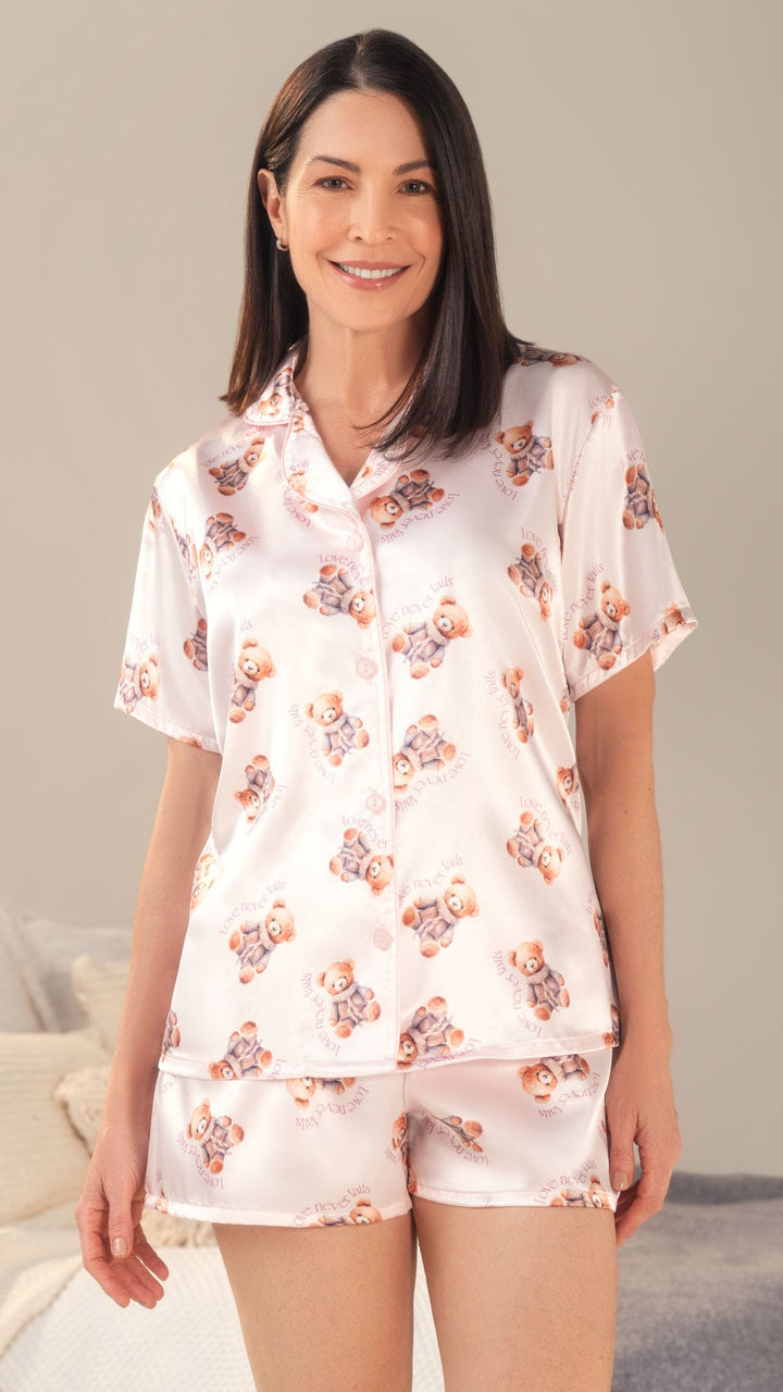 Pijama para mujer en satín estampado con camisa manga corta con botones y short de cintura elástica para un ajuste perfecto.