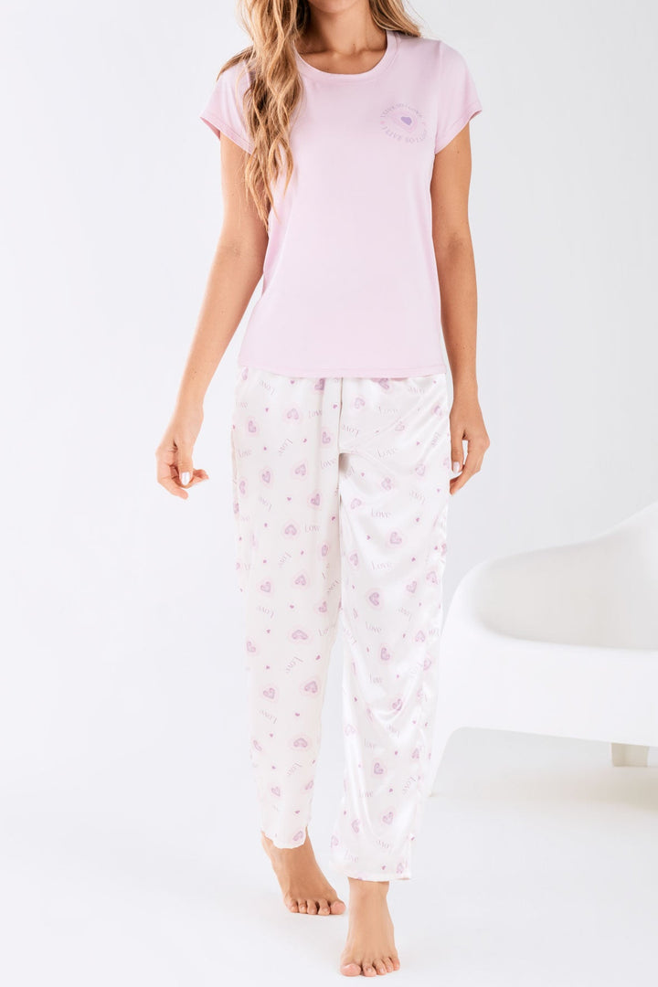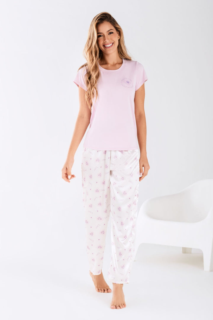 Pijama para mujer en Satín con pantalón de cintura elástica y camiseta manga corta estampada.