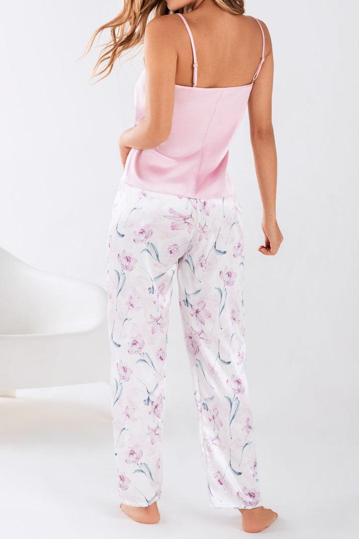 Pijama para mujer en pantalón de satín estampado con cintura elástica y blusa de tiras ajustables.