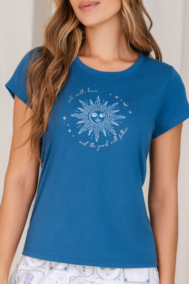 Pijama para mujer en algodón suave y cómoda. Compuesta por una Camiseta estampada manga corta, diseñada junto a un short estampado con cintura elástica.