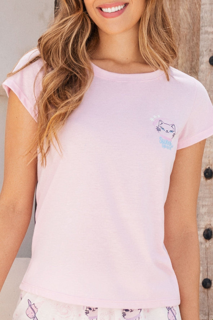 Pijama para mujer en algodón suave y cómoda. Compuesta por una Camiseta estampada manga corta, diseñada junto a un short estampado con cintura elástica.