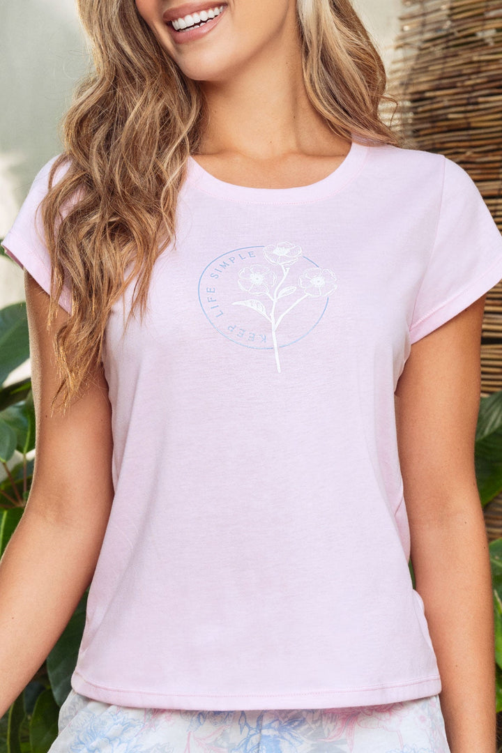 Pijama para mujer en algodón suave y cómoda. Compuesta por una Camiseta estampada manga corta, diseñada junto a un short estampado con cintura elástica.